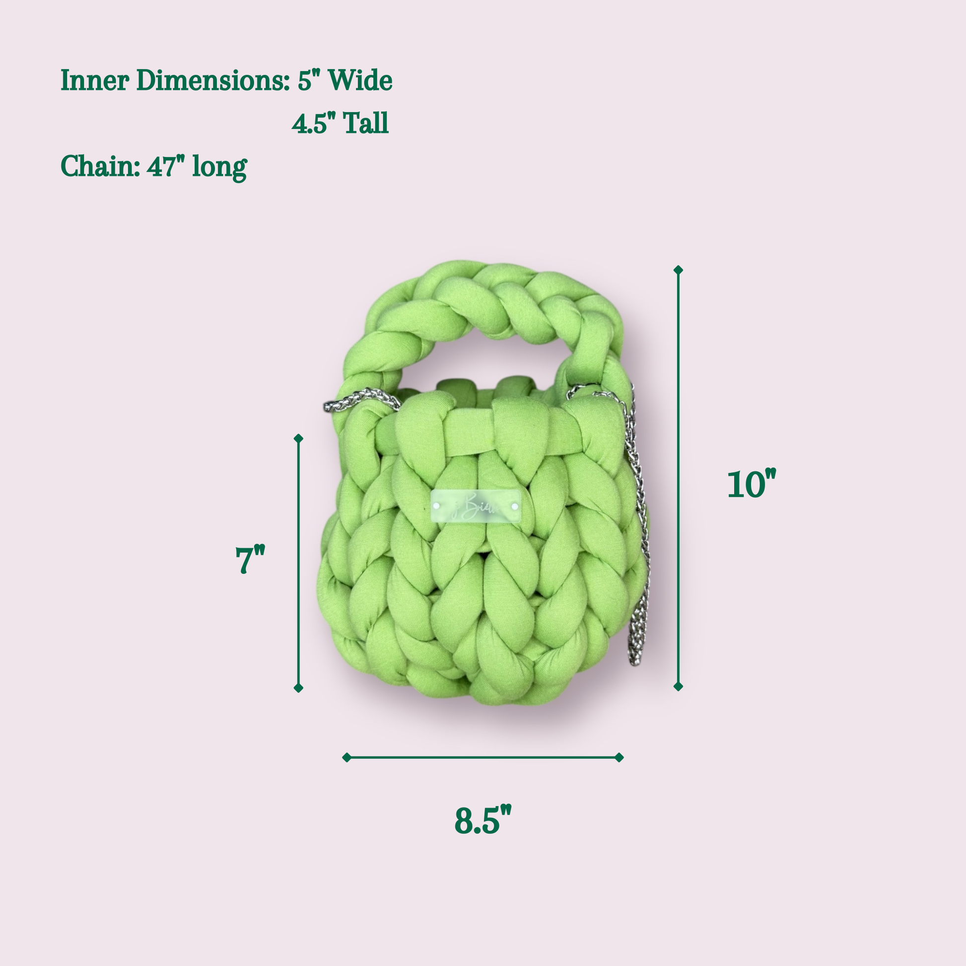 Dimensions: 8.5" wide by 7" tall. 10" tall with fabric strap. Chain strap is 47".