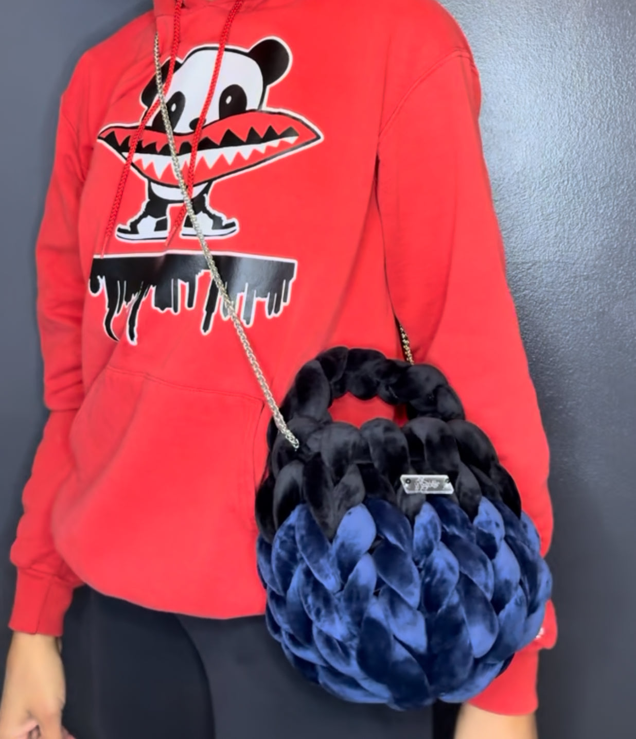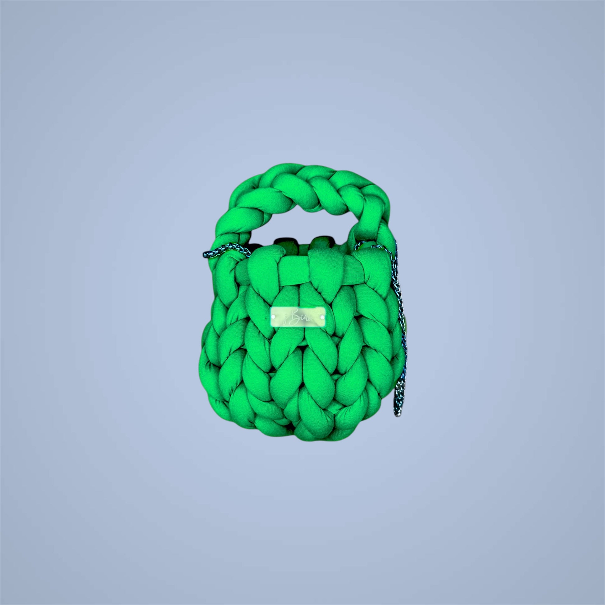 Dolly — a modern twist on the classic bucket bag, handwoven from soft cotton chunky yarn for a bold, textured look. Each bag is lined with smooth satin for a beautiful finish and can be customized with up to two colors for a truly unique design. Dolly features an acrylic logo tag with four color options and includes an additional chain strap available in four finishes, giving you even more ways to wear and style your bag.