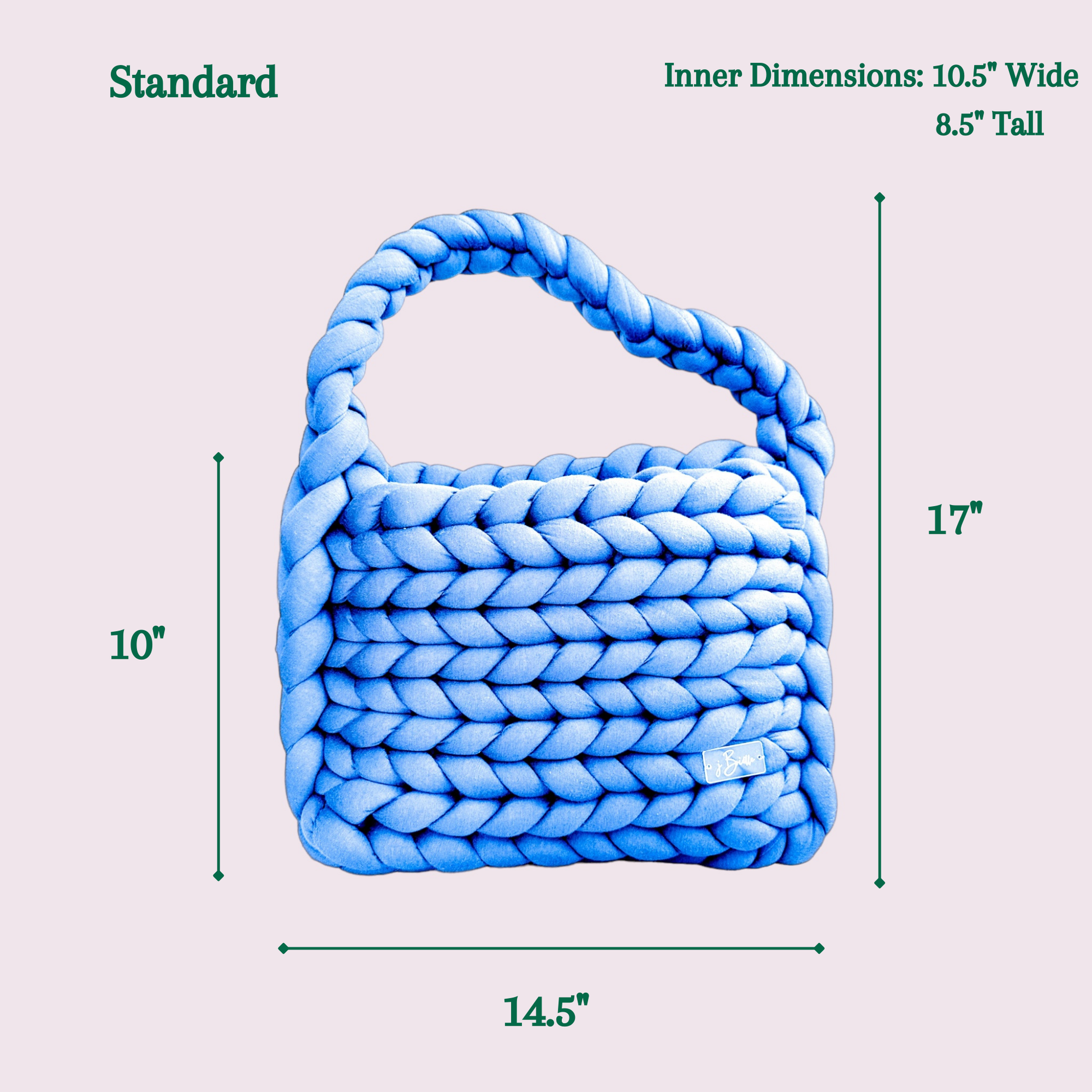Discover Sheree: Experience the ultimate blend of size and style with our largest handbag offering, the Sheree. Expertly crafted from eco-friendly chunky yarn, this spacious tote is perfect for carrying everything you need. It comfortably fits the largest iPad model, the 12.9-inch iPad Pro, and more. Our oversized option can accommodate a 15" laptop and both sizes have the option to be a crossbody!